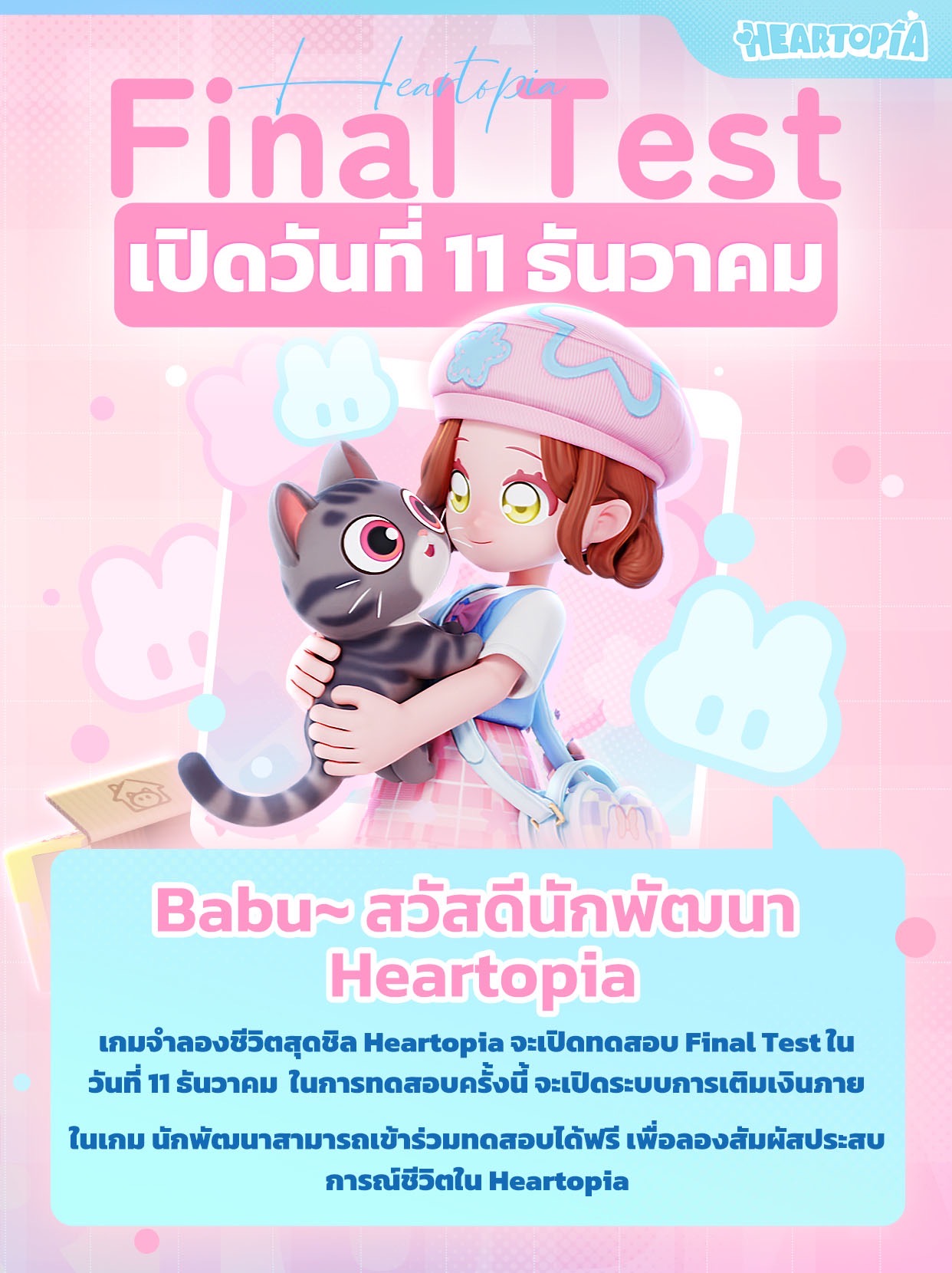 Heartopia เกมมือถือจำลองการใช้ชีวิตสุดสโลว์ไลฟ์ จากทีมพัฒนาของบริษัท XD Inc เกมจำลองการใช้ชีวิตที่เล่นได้อย่างอิสระตามใจ เกม Heartopia เตรียมเปิดทดสอบ Final Test ทั่วโลก ตั้งแต่ 11 ธันวาคม 2568เวลา 10.00 จนถึง 24 ธันวาคมนี้เท่านั้น