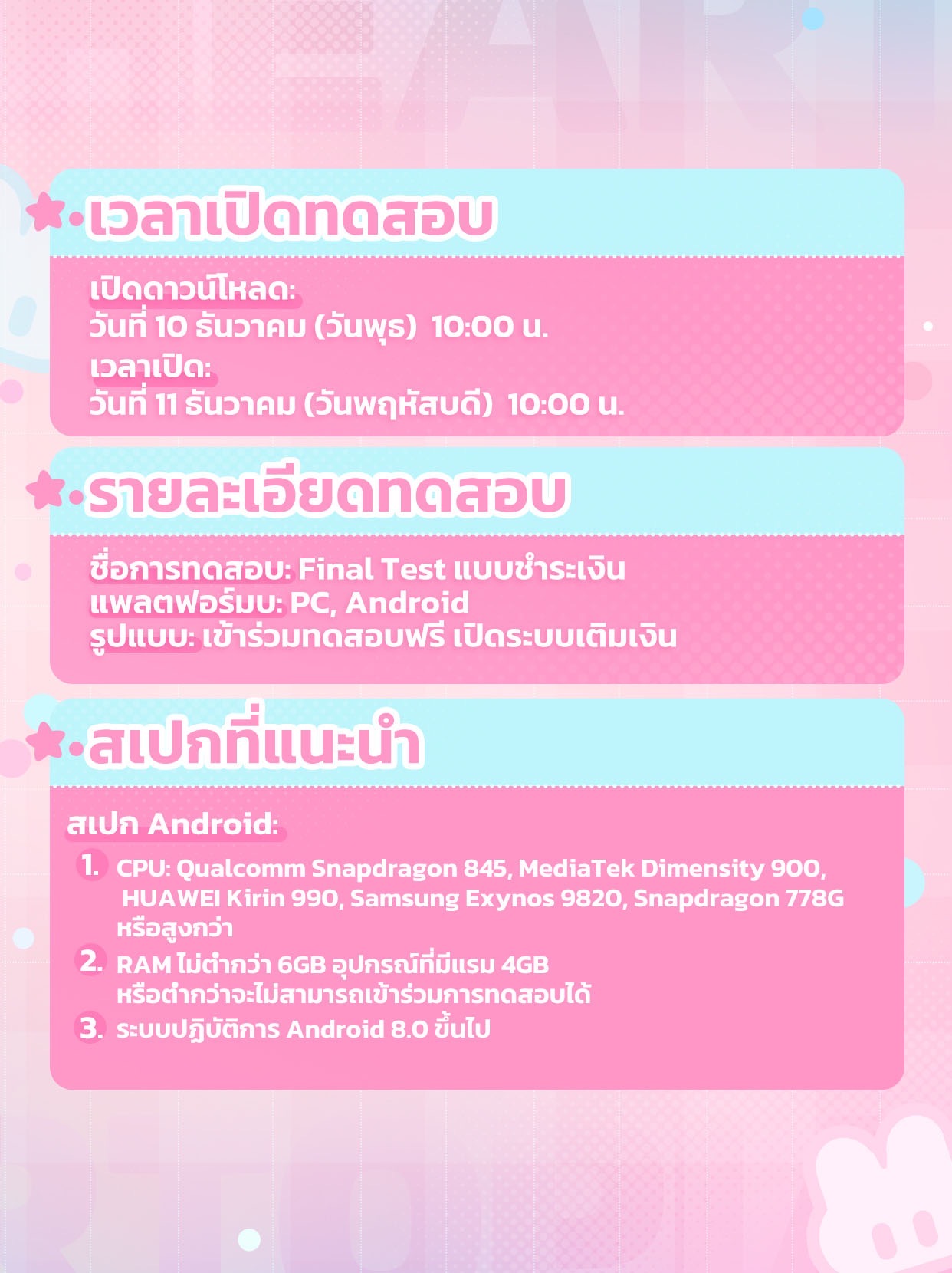 เมื่อเกมเปิดตัวอย่างเป็นทางการ ผู้เล่นทุกคนที่เข้าร่วมทดสอบ CBT ครั้งแรกและ Final Test จะได้รับรางวัลที่ระลึกดังกล่าวข้างต้น!