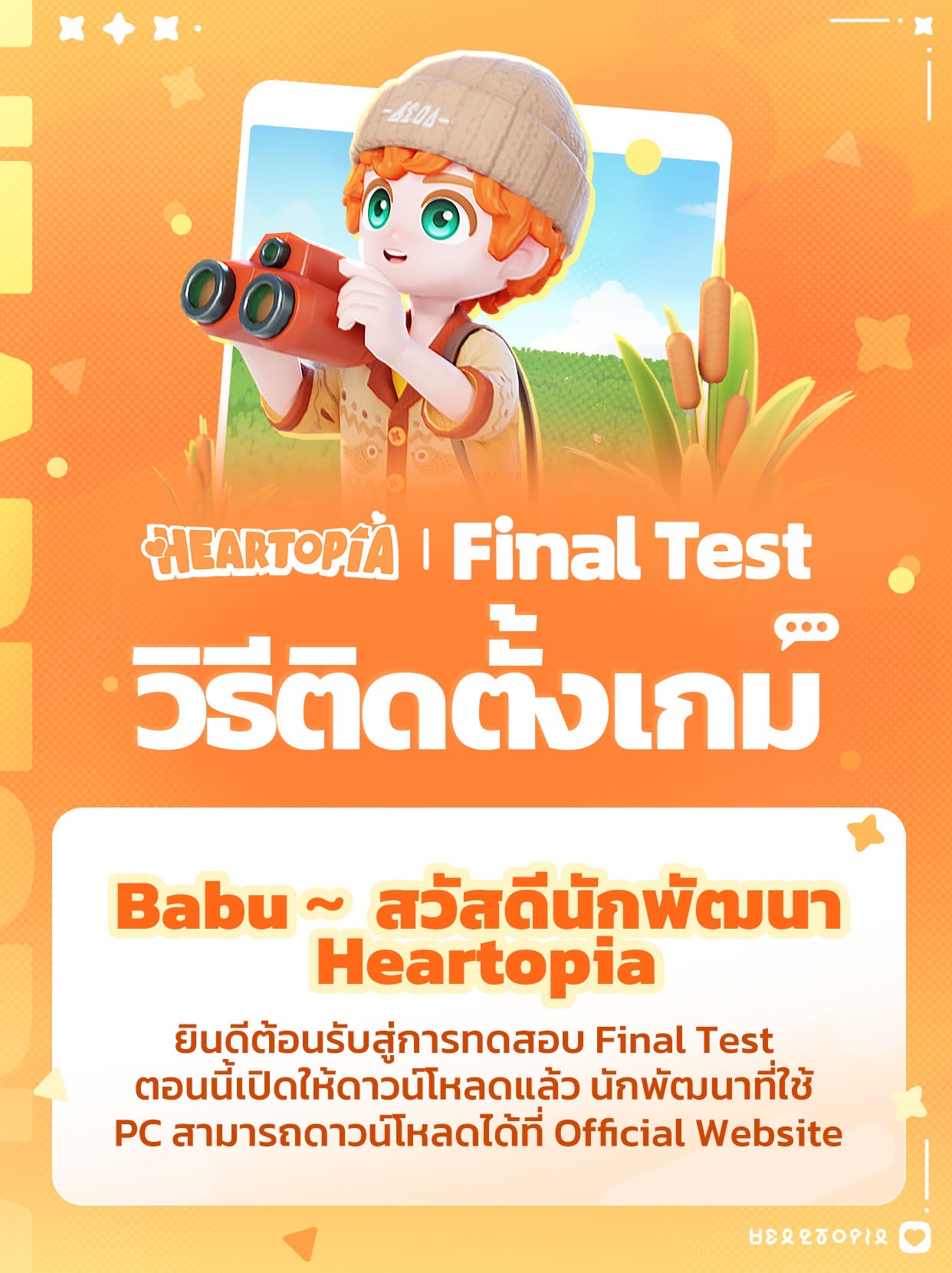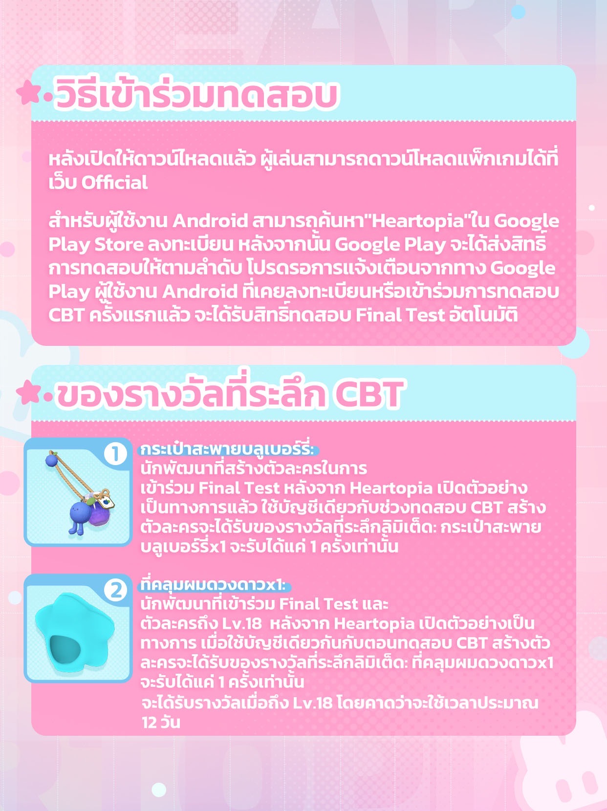 เพื่อขอบคุณทุกคนที่เข้าร่วม เกม Heartopia ได้เตรียมของขวัญสุดพิเศษมาให้นักพัฒนาที่เคย เข้าร่วมทดสอบ CBT ในครั้งแรก ใน Final Test ครั้งนี้สามารถรับรางวัลที่ระลึก: ที่คลุมผมดวงดาวและกระเป๋าสะพายบลูเบอร์รี่