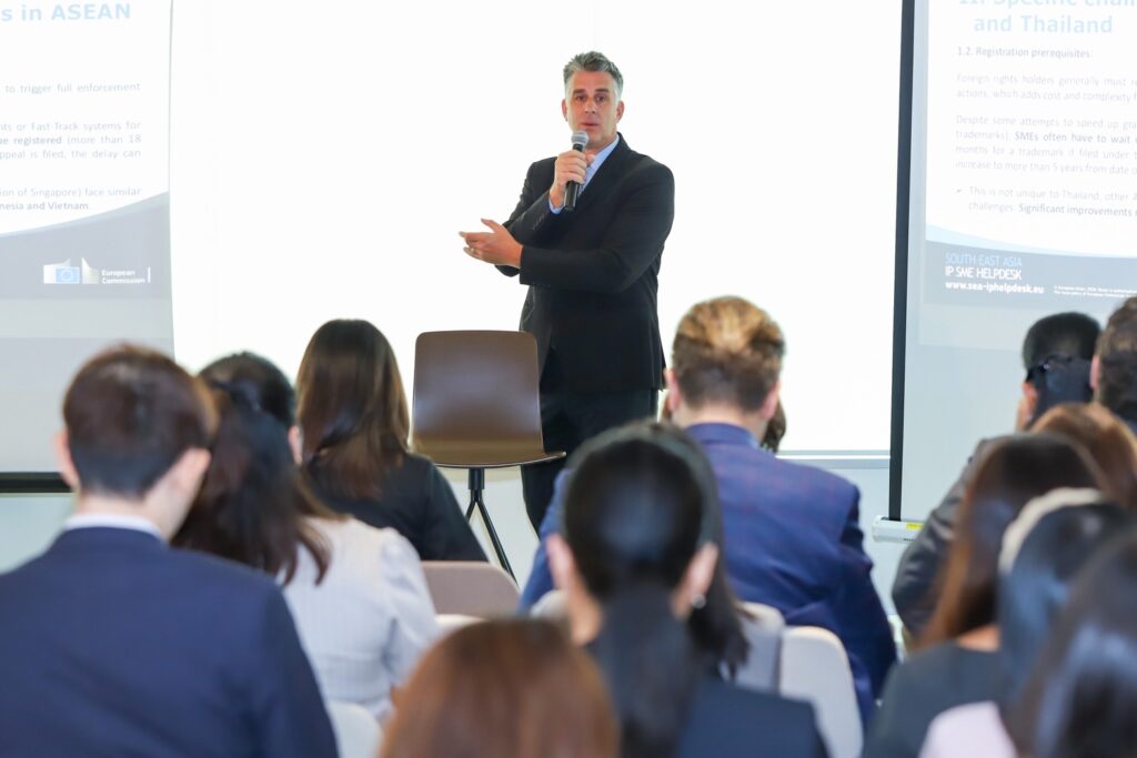 ภายหลังกล่าวต้อนรับผู้เข้าร่วมสัมมนา โดย นางภารณี อดุลยพิเชฏฐ์ ประธานสมาคมการค้ายูโรเปียนเพื่อธุรกิจและการพาณิชย์ (EABC) เป็นการแสดงปาฐกถาพิเศษโดย นางสาวพริ้วแพร ชุมรุม รองอธิบดีกรมทรัพย์สินทางปัญญา และถ้อยแถลงเกี่ยวกับความร่วมมือระหว่างสหภาพยุโรปและประเทศไทยโดย Ms. Claire Castel, IP Regional Attache for South East Asiaผู้แทนสหภาพยุโรปประจำประเทศไทย